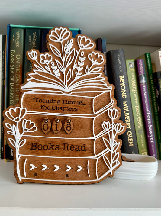 Blooming Through the Chapters – Wooden Books Read Tracker with Number Storage Box | Book Lover Gift