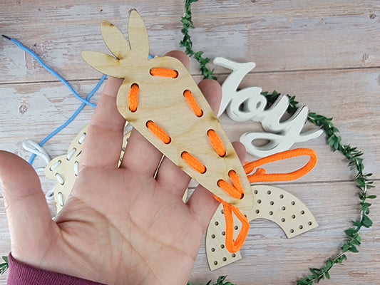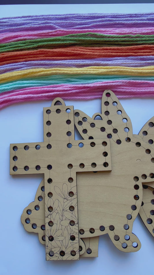 Kids Easter Wooden lacing craft kit with bunny, egg, carrot, rainbow, and cross shapes