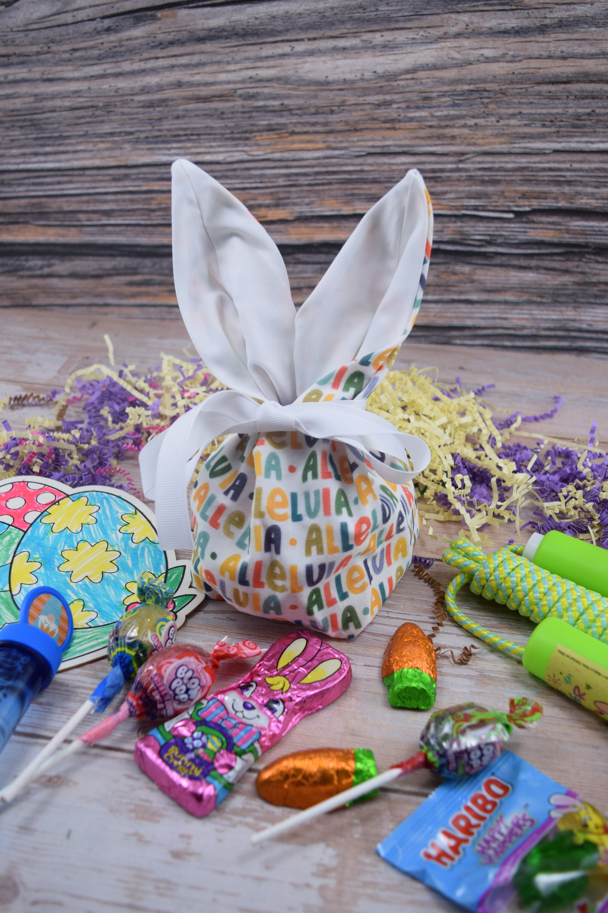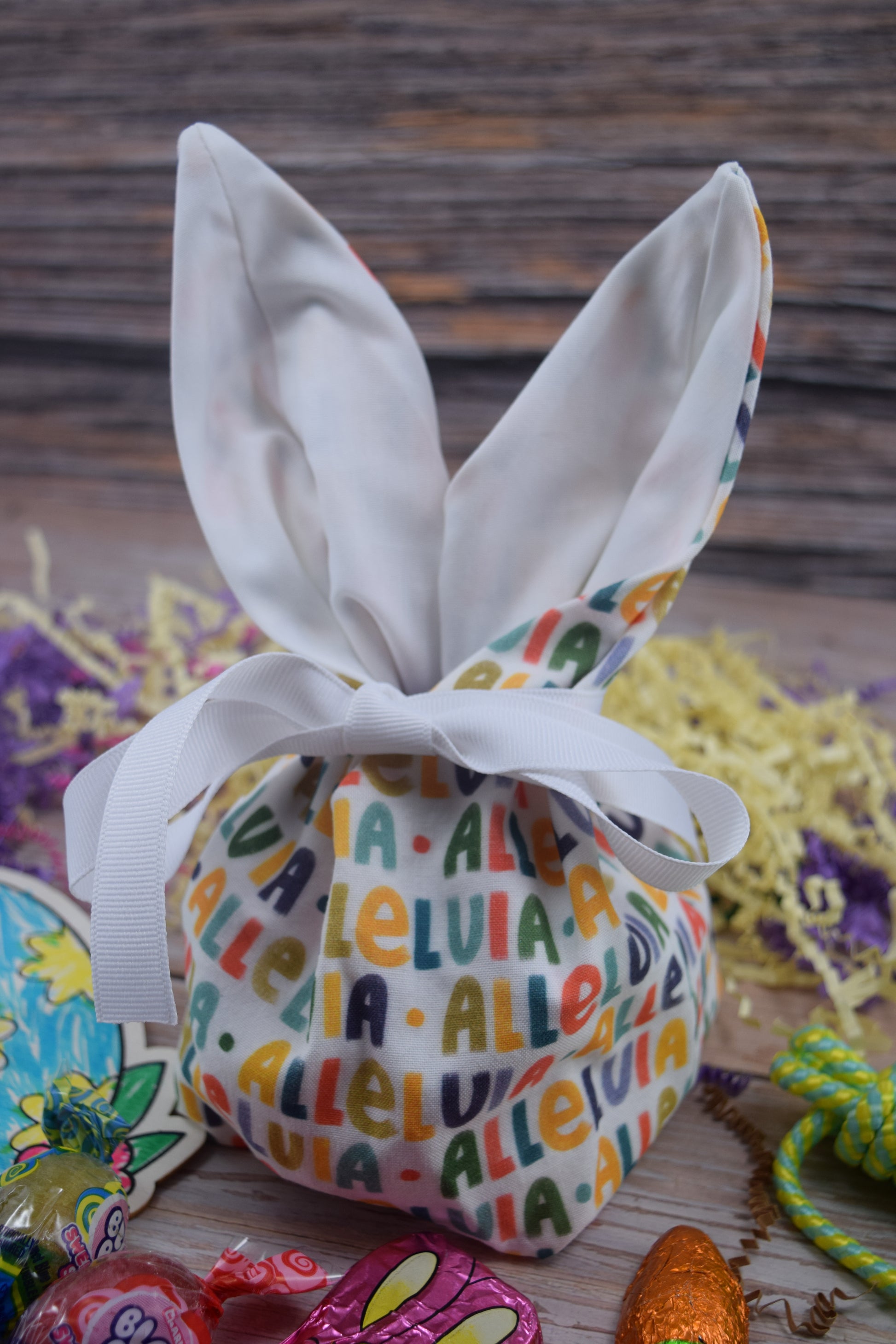 The print on the exterior of the bag is multicolored Alleluias on a white background. The interior of the bag is lined with a bright white cotton fabric. The bag measure 4" across the bottom and 5" tall (not including the ears.) Ears add an extra 4" in height. Please note that since each item is handmade there will be slight variations on pattern placement.