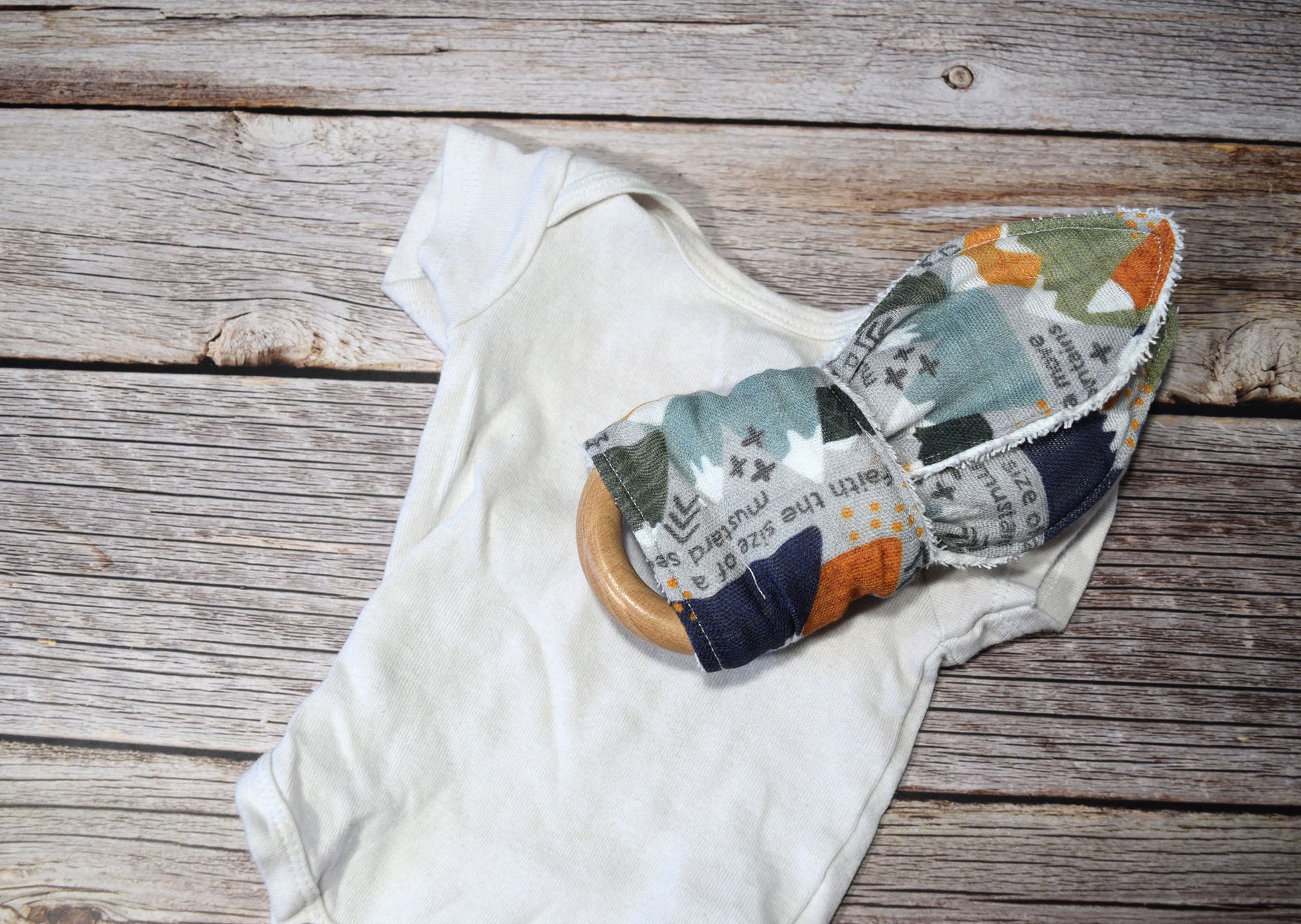 Teething is a very uncomfortable process for babies, but we can help! This teething toy will soothe your little one as they press their sore gums against the soft 100% organic cotton gauze. The fabric and wood are made from materials that are safe for baby to chew on. The ears have Faith Can Move Mountains on the front and is backed with white terry cloth for extra absorbency and durability.