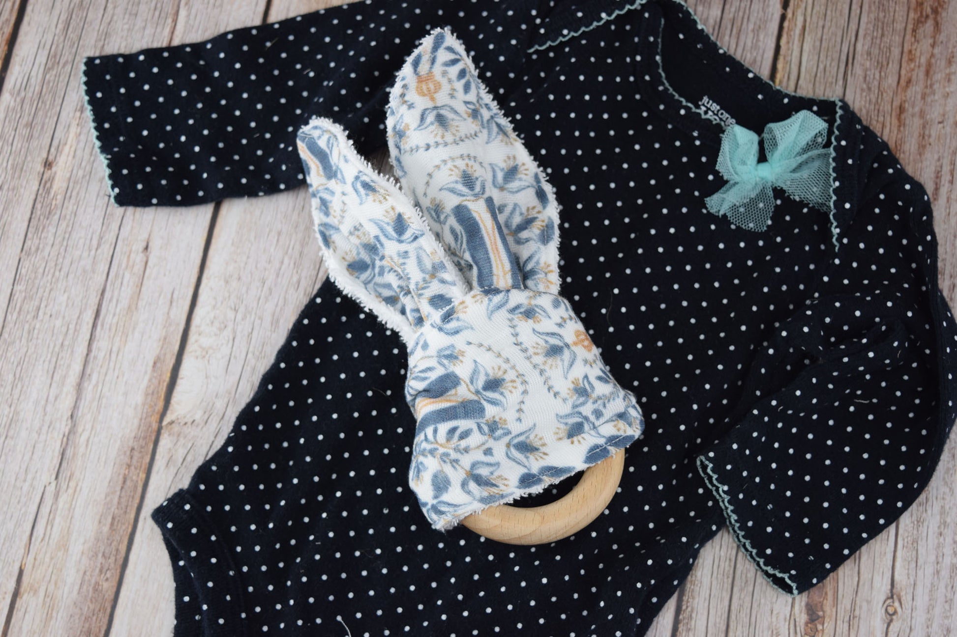Sweetly colored and soft, this bunny fabric toy has a wood ring that can be gently hand washed and reconditioned with coconut oil. The ears are able to be untied so you can machine wash them for extra hygiene.