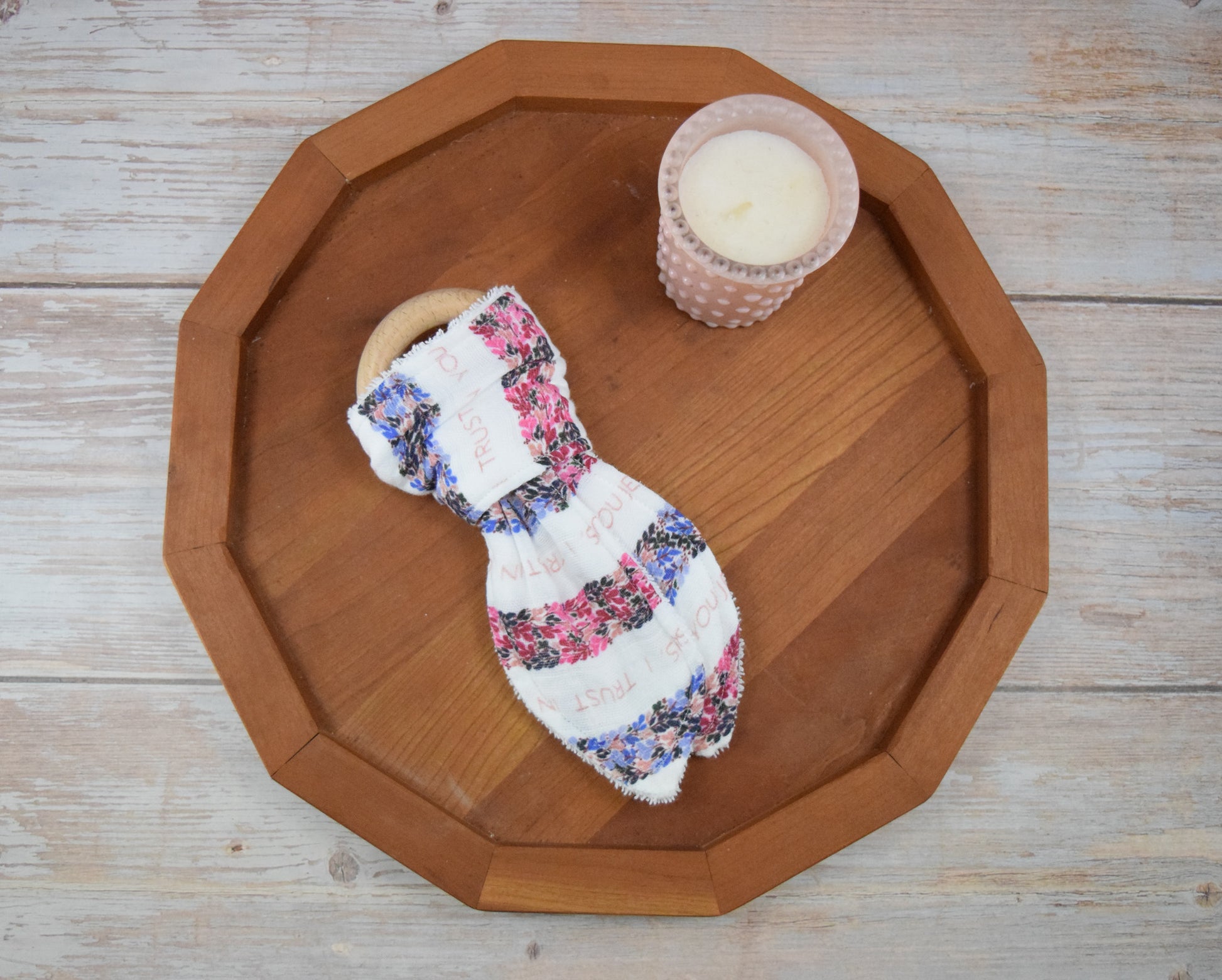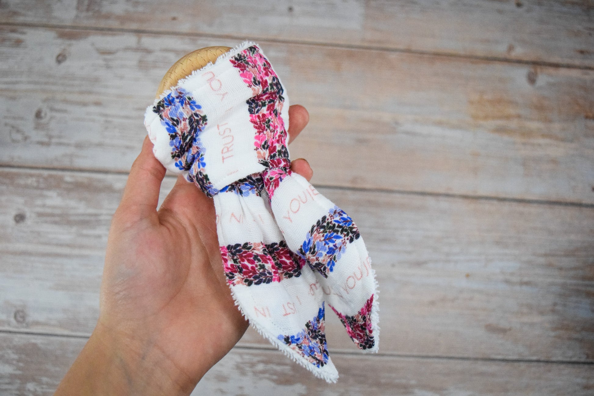 Teething is a very uncomfortable process for babies, but we can help! This teething toy will soothe your little one as they press their sore gums against the soft 100% organic cotton gauze. The fabric and wood are made from materials that are safe for baby to chew on. The ears have our floral Divine Mercy print on the front and is backed with white terry cloth for extra absorbency and durability.