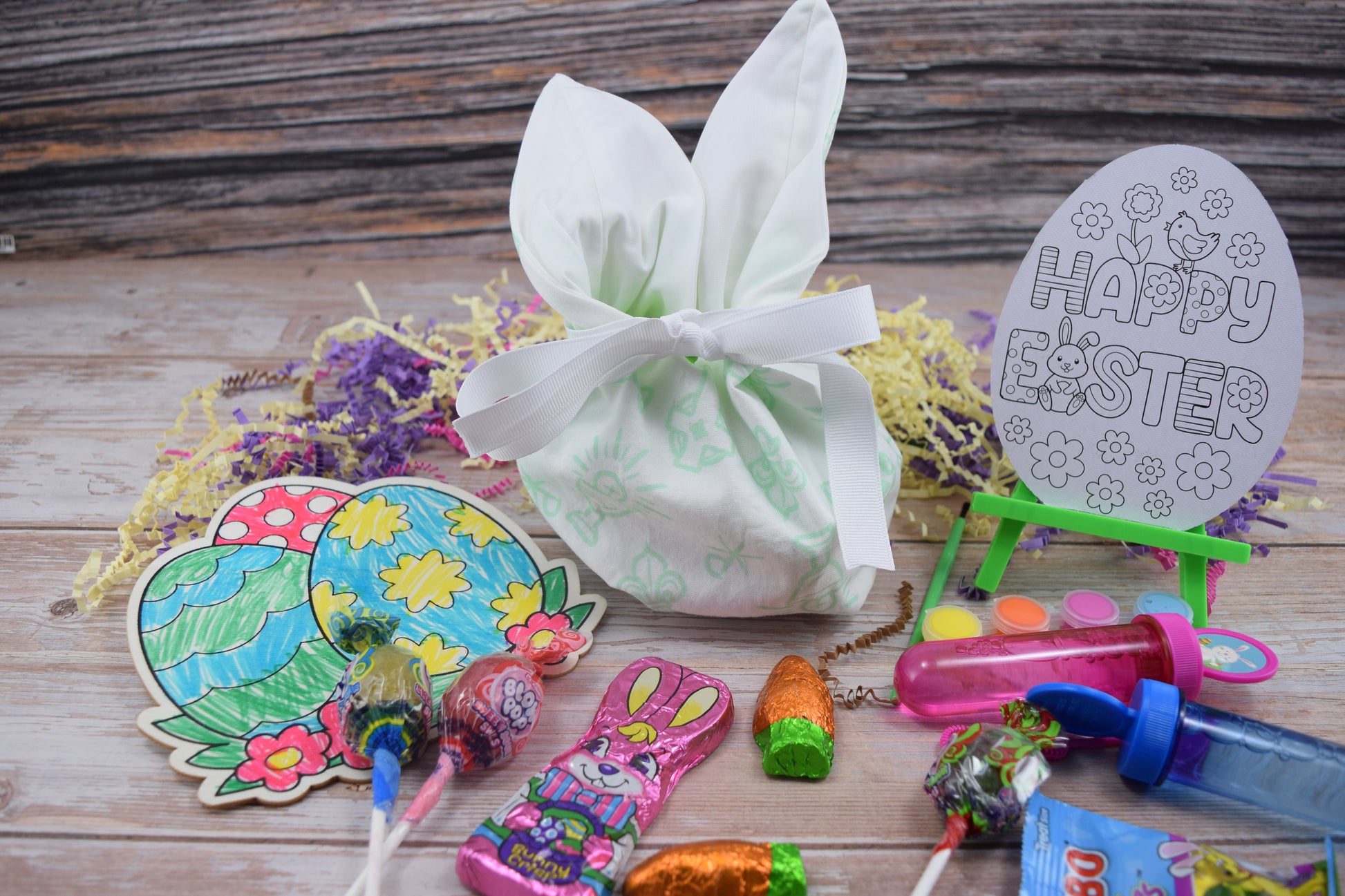 Sweet little bunny treat bags that would make a great addition to an Easter basket or for other springtime celebrations. This bunny treat bag is great for holding candies and other small trinkets. Simply tie the white ribbon around the outside and the goodies are safely secured.
