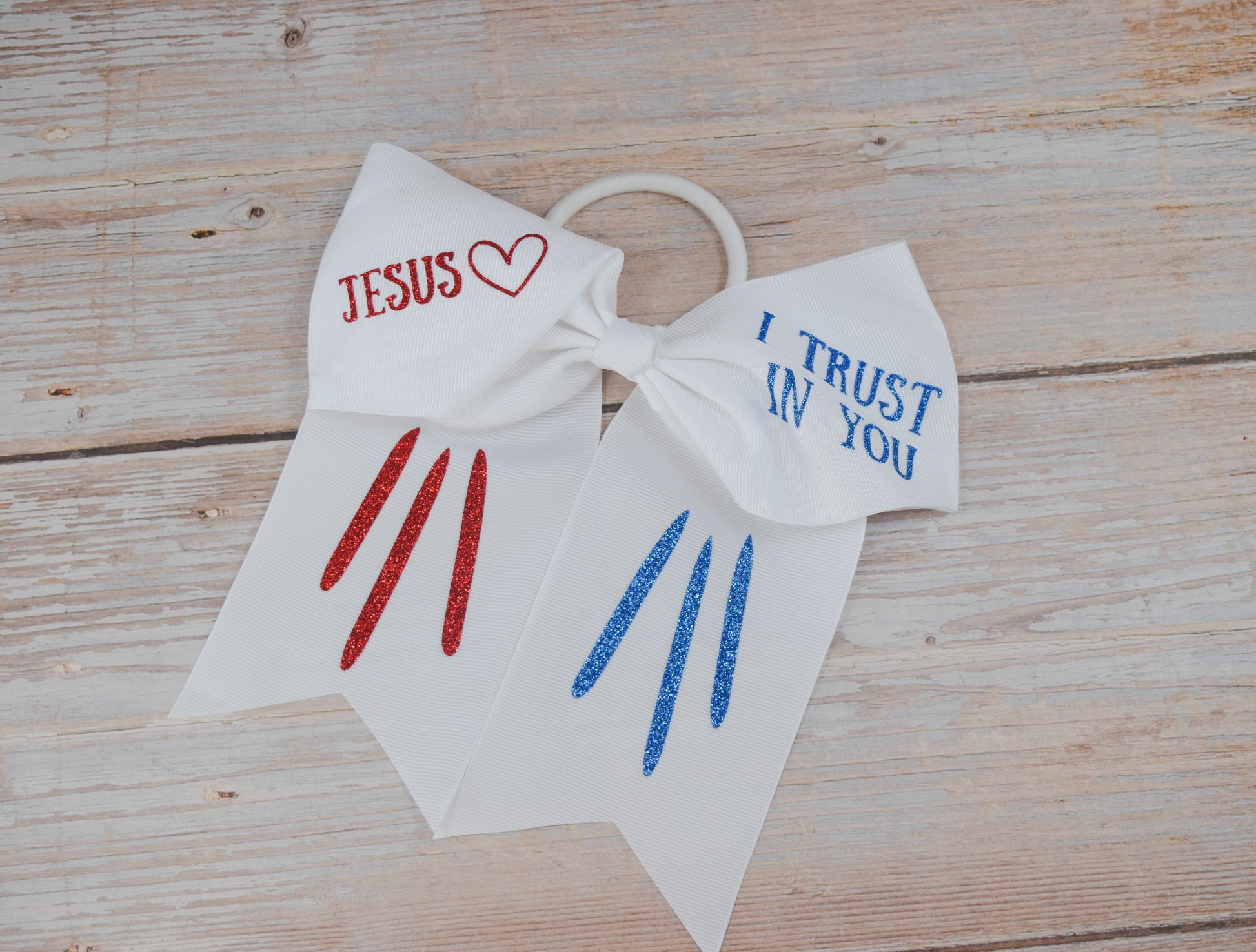 Brighten your hairstyle with our Divine Mercy Cheer Hair bow, a beautiful way to share your faith and style! This lovely bow is made from smooth, shiny white grosgrain ribbon and secured to a white hair tie. The bow is about 4 inches wide, perfect for ponytails, braids, or half-up styles. In pretty, sparkly red and blue letters, it says " Jesus I trust in you," and there are sparkly red and blue rays on the tails of the bow.