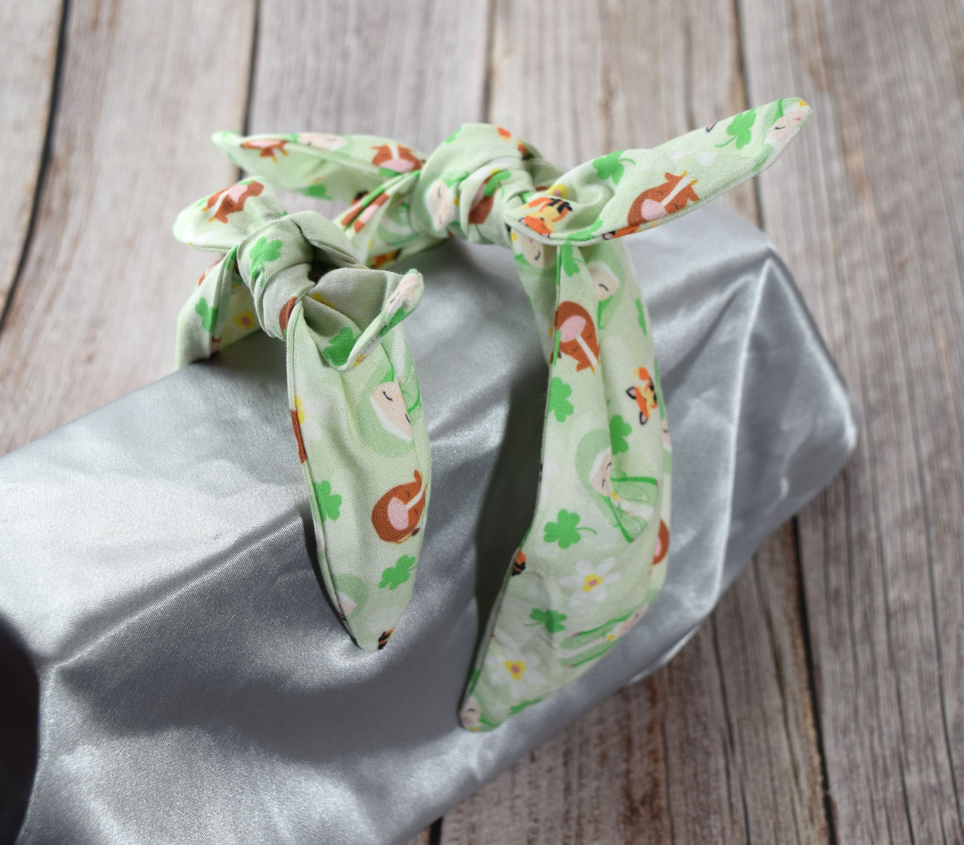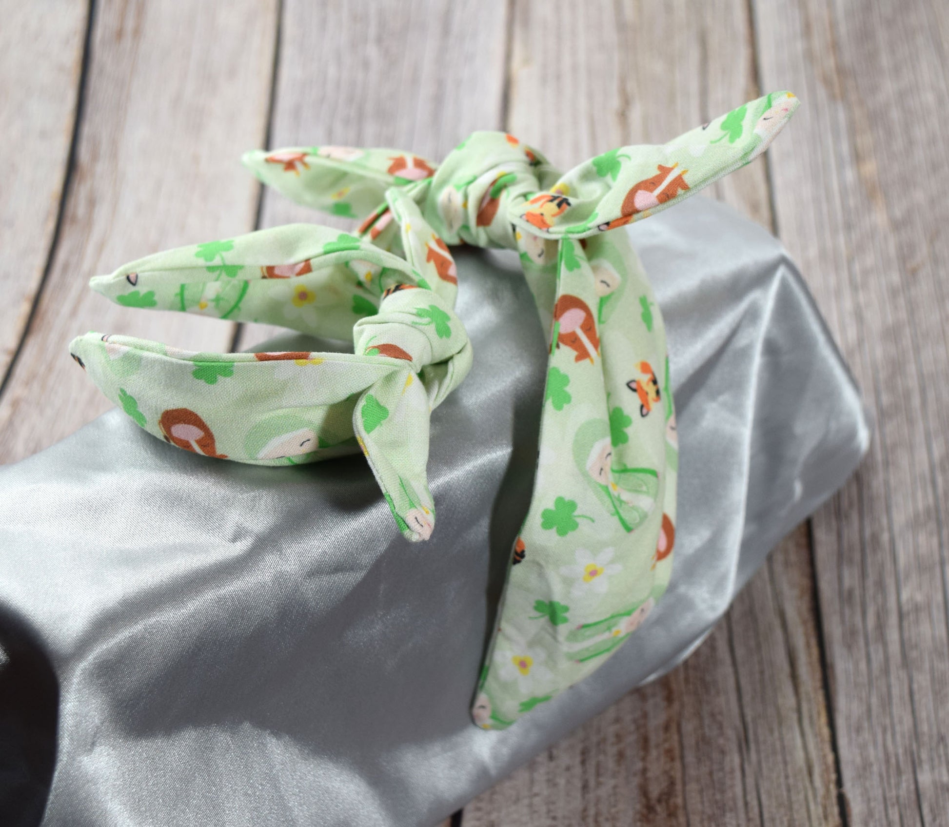 This headband set boasts a delightful print of St. Brigid, charming cows, and playful foxes set against a light green background, adding a touch of whimsy and joy to your matching doll and girl headbands set.