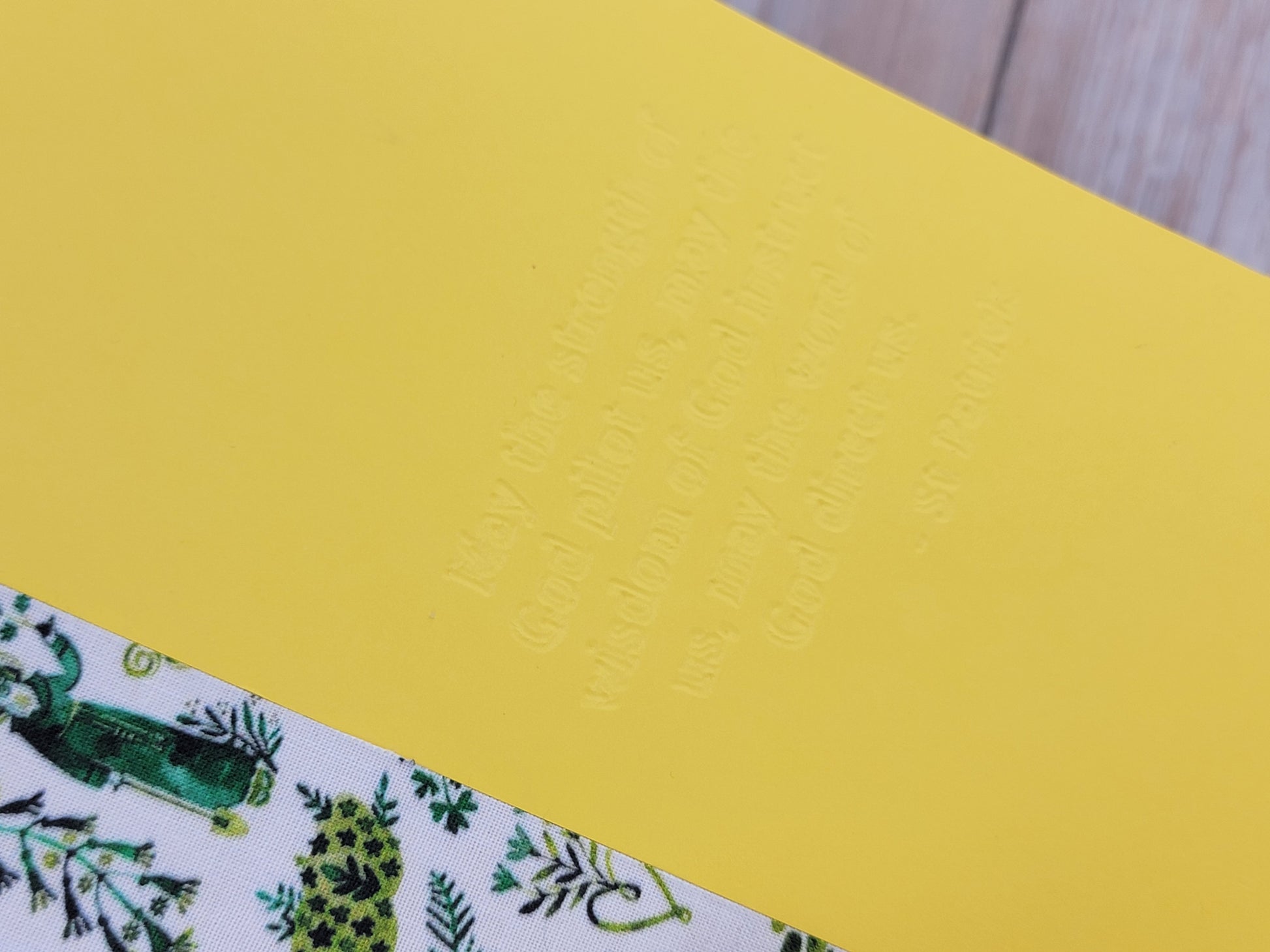 Looking for a beautiful and meaningful way to document your spiritual journey? Look no further than our Ireland Saints Embossed Journal! This stunning journal features an inspiring quote from St Patrick, embossed on the yellow front cover, along with a charming strip of cotton fabric on the spine. The quote reads: "May the strength of God pilot us, may the wisdom of God instruct us, may the word of God direct us."