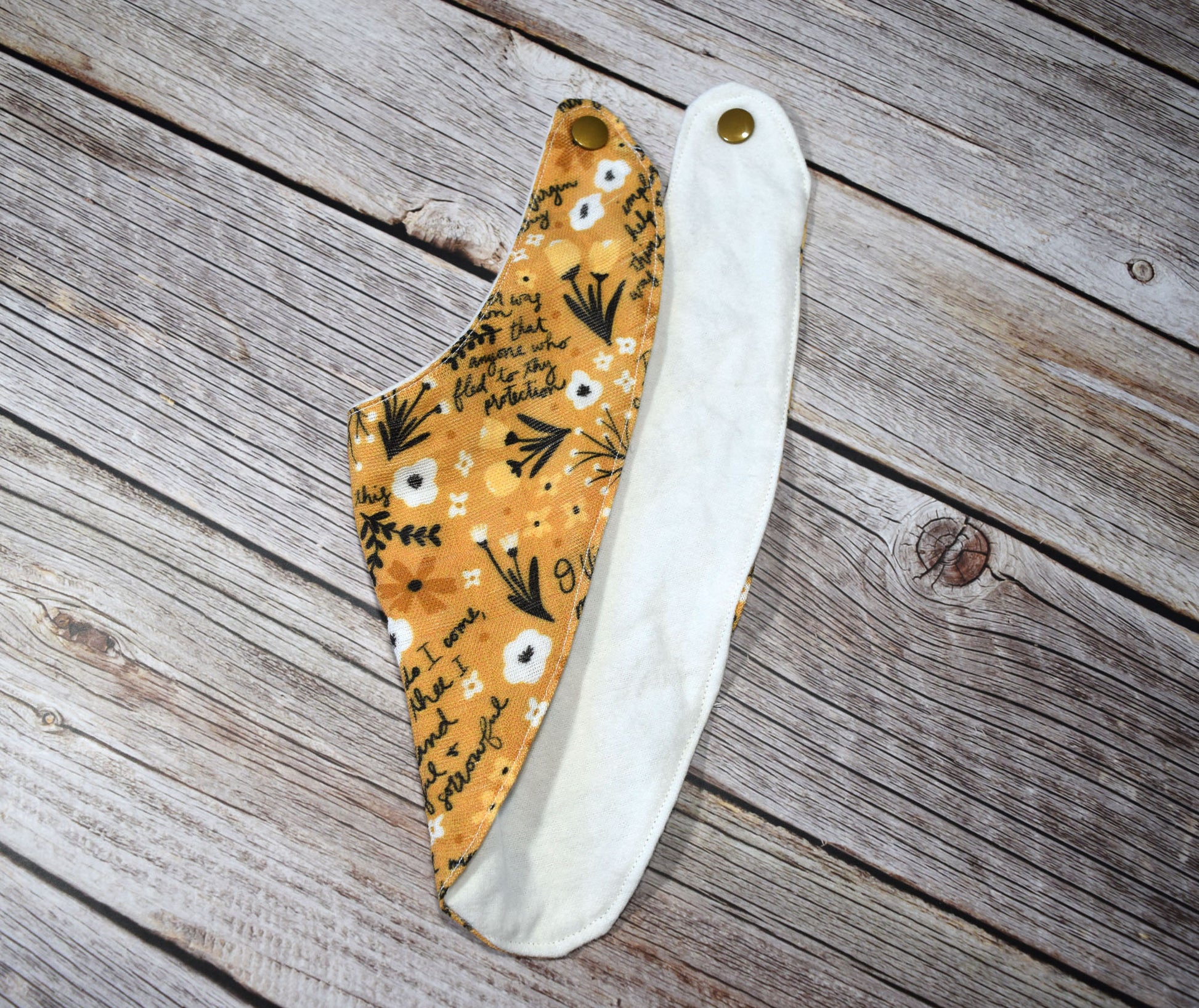 Crafted from high-quality yellow cotton gauze fabric, the front of this bib features flowers with the Memorare prayer woven among the flowers that add a touch of elegance to your baby's outfit. The back of the bib is made from soft and lightweight white flannel, making it perfect for babies who do not drool as much.