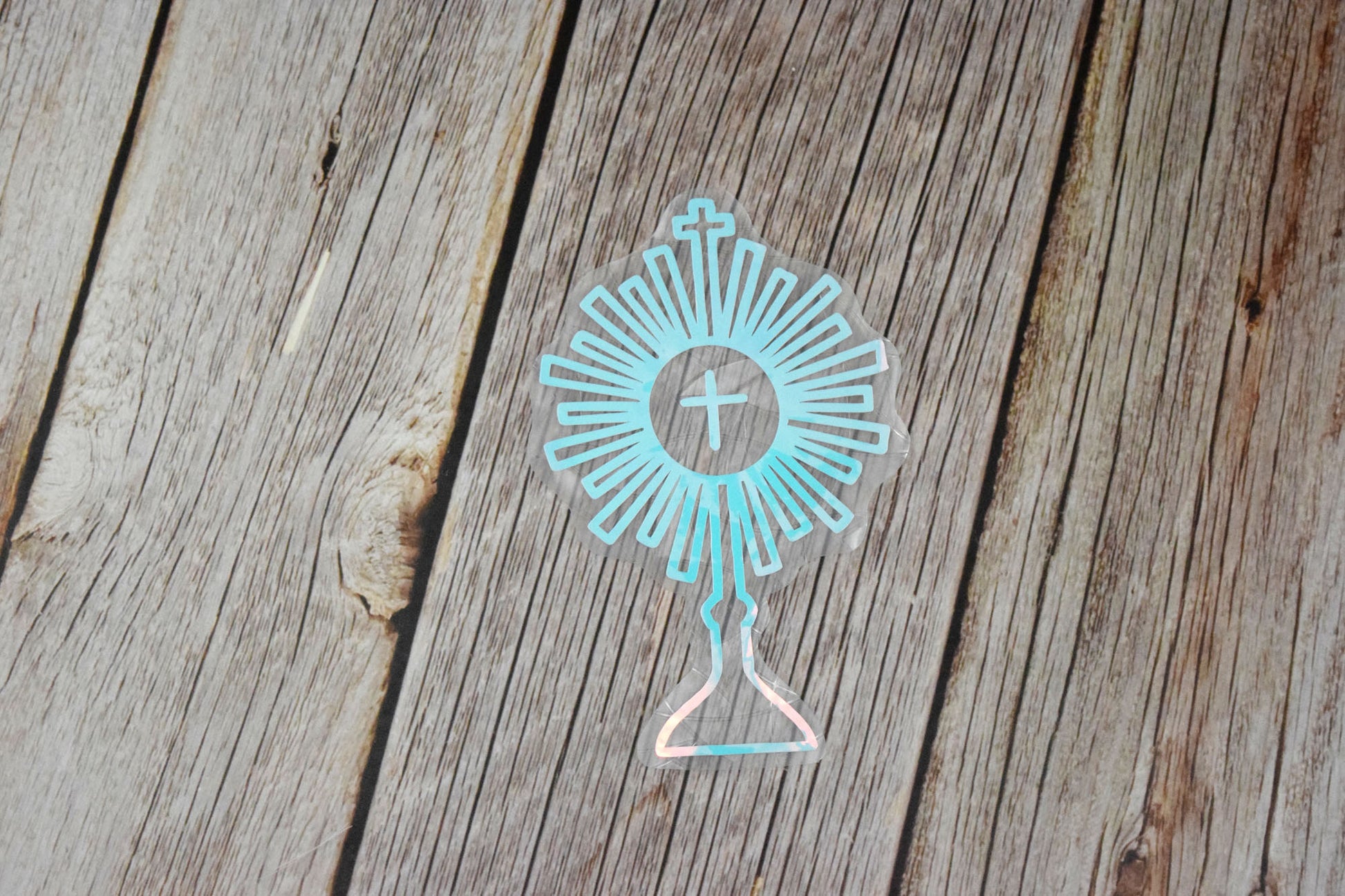 Display your faith in a unique way with our Monstrance suncatcher! This suncatcher is easy to apply and reapply as many times as you would like without leaving any sticky residue on the window.