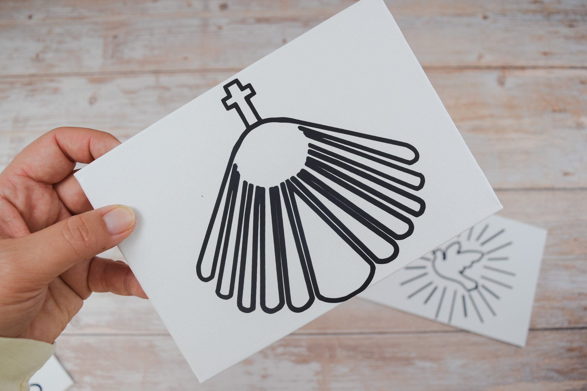 Choose from the Baptism shell, 1st Communion host and chalice, Confirmation Holy Spirit Dove or get all three canvases. Each canvas measures 5x7.