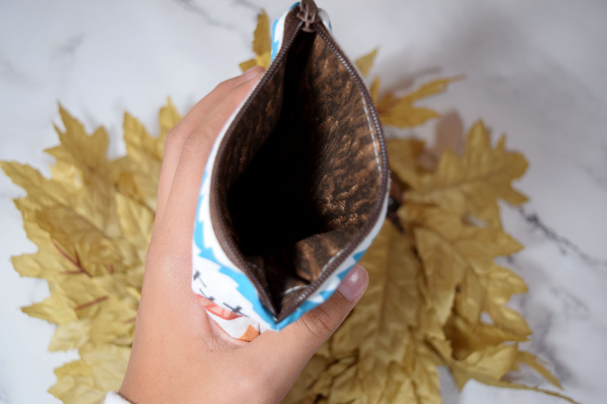 The pouch dimensions are approximately 5 inches by 4.5 inches. Please note that due to the unique nature of the fabric, every pouch is one-of-a-kind with its own pattern placement, making each purchase a truly special and exclusive experience!