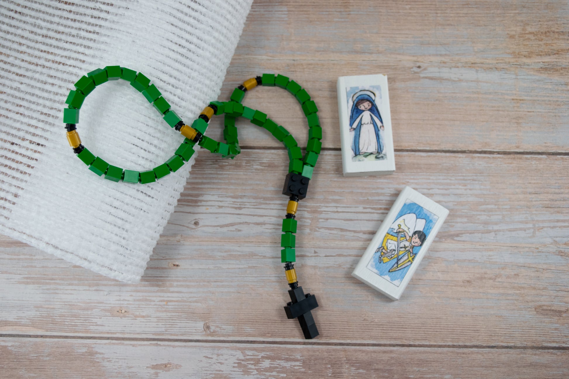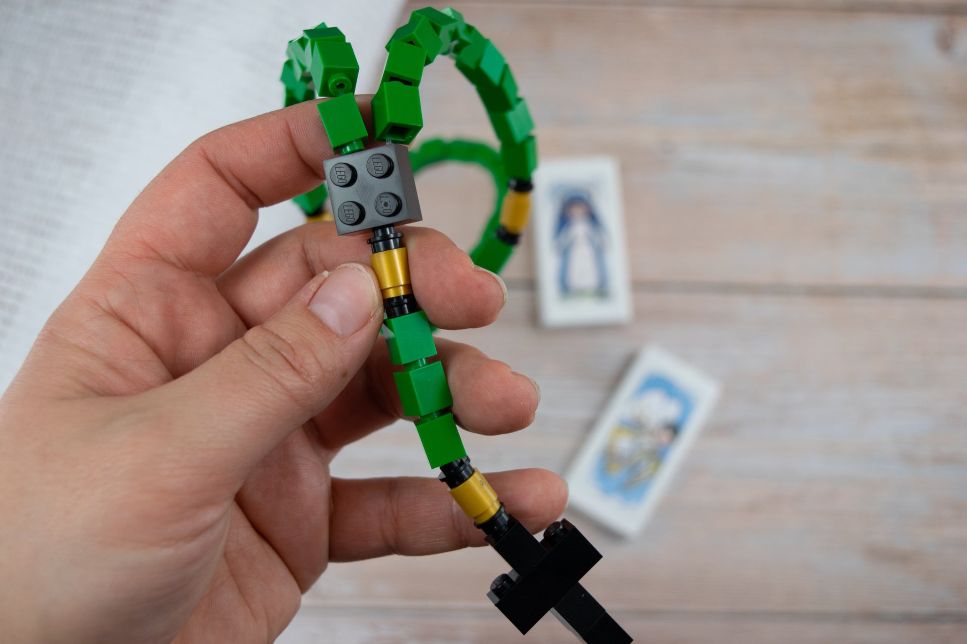 This St Patrick rosary is made from green, black, and gold Lego bricks.