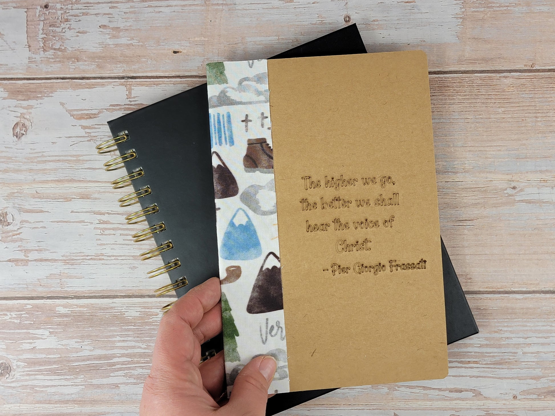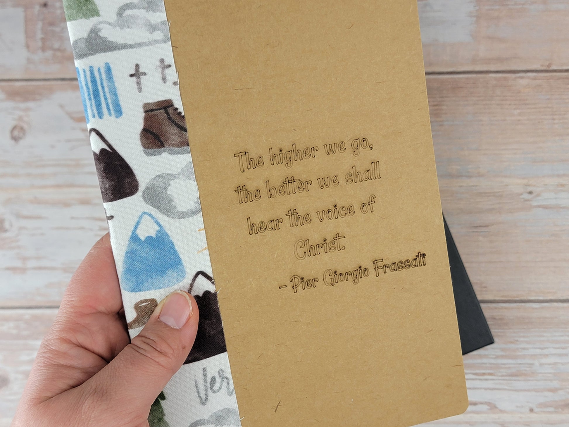 Please note that due to the unique nature of the fabric, pattern placement may vary, making each journal truly one-of-a-kind. So why wait? Start documenting your spiritual journey today with our beautiful St Pier Giorgio Frassati Embossed Journal.